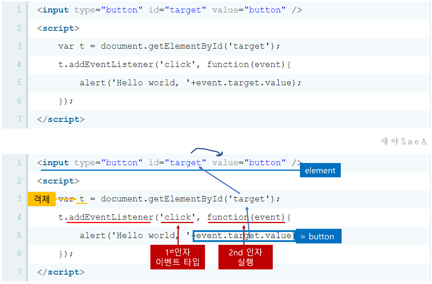 t라는 객체에 위와 같은 addEventLstener를 등록하면, [click]하면 두 번째 인자에 있는 함수가 실행됩니다.