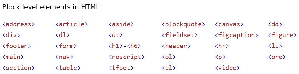 block level의 element는 항상 새로운 line에서 시작하며 전체적인 width값을 가집니다. 이러한 특성으로 인해 block level의 elements들이 연속적으로 작성될 경우, block처럼 위에서 아래로 쌓아집니다.