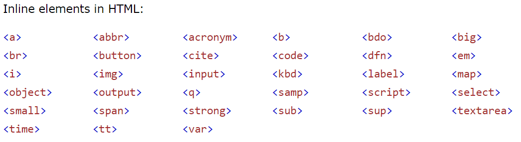 Inline-level elements들은 block가 전체 line을 차지하는 것에 반해, 딱 text가 차지하는 길이 만큼만 차지한다고 생각하시면 됩니다. inline-level의 elements들이 연속적으로 작성될 경우, text처럼 나란히 작성이 됩니다.
